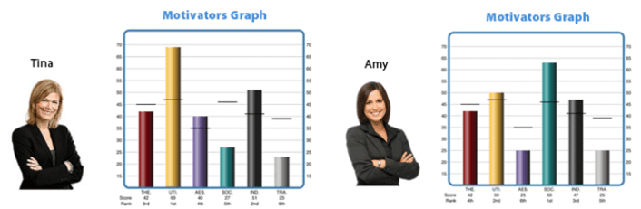 Con el perfil de Motivadores de Tina, podríamos ver que tiene un Utilitario extremadamente alto (amarillo) y Social bajo (verde). Lo que esto significa es que ella valora los resultados financieros mucho más que ayudar a los demás. Esta combinación la impulsa a presionar a su equipo para que gane más dinero, lo que luego se intensifica con su estilo de comportamiento D alta